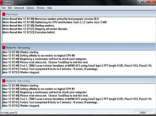 Принцип действия достаточно прост: прога проводит вычисления, полученный результат сравнивается с эталонным (заранее известным) на диске; если они не совпадают, Prime сообщает об ошибке. Prime отлично справляется с проверкой на стабильность процессора, L1 и L2 кэша, памяти и материнской платы. К сожалению, он не ответит на вопрос, что именно из вышеперечисленного вызвало сбой; это предстоит выяснять вам.
