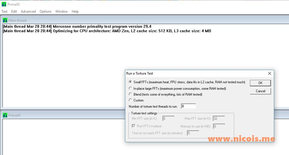Prime95 features a `Torture Test` that puts your CPU and RAM to the test primarily for guaranteeing the correct execution of the application on that particular PC. It comes in three variations, from `Small FFTs` to `In-place large FFTs` as well as the cruel `Blend` mode that generates the maximum stress for your system. One thing you have to take into consideration is that you need during the operation is, at all times, a monitoring tool for your computer’s temperatures.