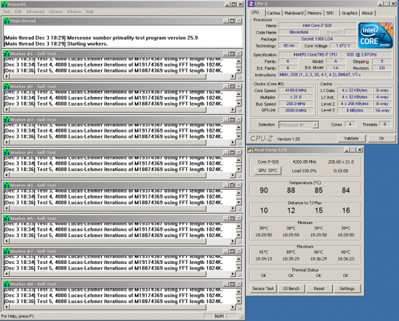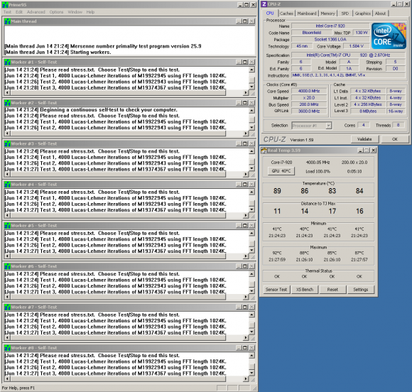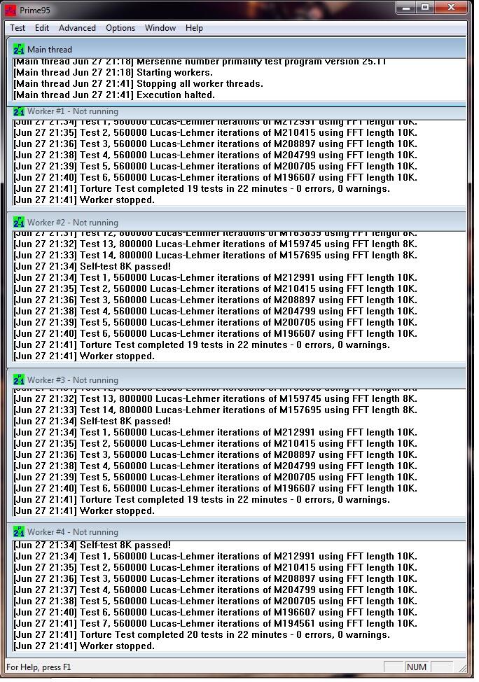 Prime оптимизирован под большинство процессоров, и при работе загрузит (а значит, и проверит) все исполнительные блоки вашего камня. Тем, кому необходима абсолютно стабильная система, придётся гонять Prime где-то около 5-6 часов. Больше, чем 24 часа, проверять бессмысленно, да я думаю, никто и не будет так долго ждать.