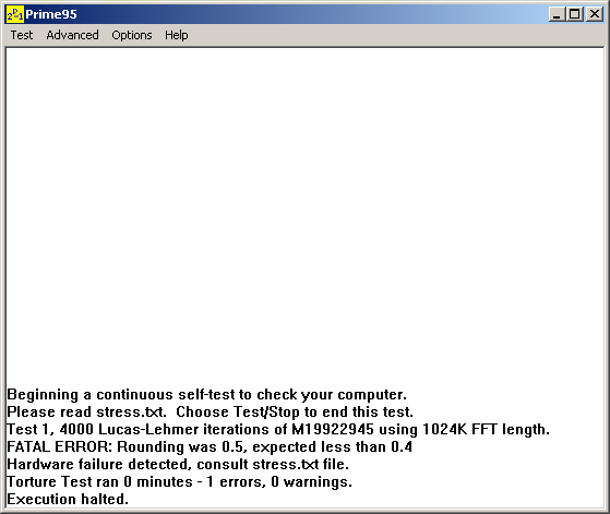 С этим разобрались… Если же тест выдал сообщение «FATAL ERROR: Rounding was 0.5, expected less than 0.4» и так далее… Вот тут можно сказать однозначно, ваша система работает ненадёжно и где-то произошёл аппаратный сбой. Не успокаивайте себя мыслями следующего содержания: «…ведь у меня всё работает стабильно… …дурацкая программа, сырая, глюк на глюке, сотру её и буду жить спокойно.