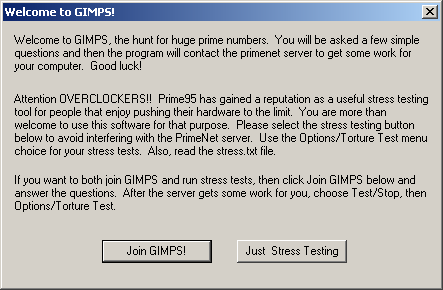 - Присоединиться к проекту GIMPS. То есть все производимые вычисления будут использованы для поиска новых простых чисел по алгоритмам Мерсенна. Для работы данной функции необходимо подключение к интернету.