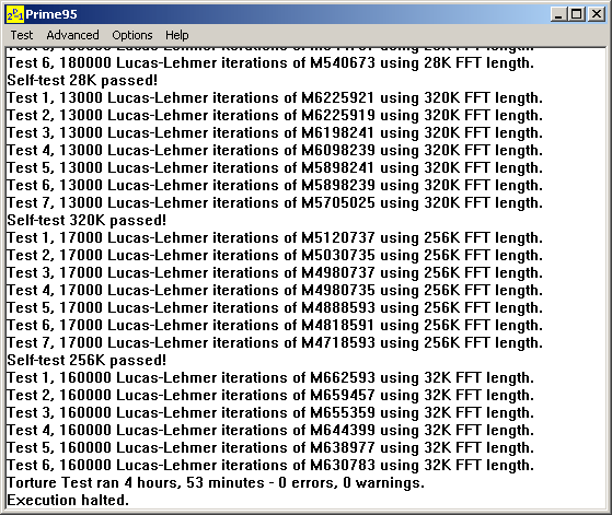 The successful pass of the `Torture Test` ensures you of one rock solid computer configuration. The recommended number of hours that you should run this test, if sure of your system’s stability, is twenty-four. Beware that your processor will produce a great deal of heat and may even break down due to the extreme FPU (floating point units) utilization.