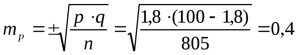 Показатель летальности в терапевтическом отделении, где пролечились 805 больных, составил 1,8%. Определить ошибку репрезентативности показателя (mр).