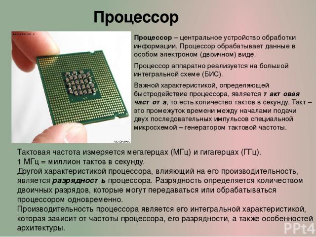 Процессор персонального компьютера или встроенный в небольшие устройства часто называют микропроцессором. Этот термин означает, что элементы процессора содержатся в одной микросхеме. Некоторые компьютеры будут работать с использованием многоядерного процессора — чипа, содержащего более одного процессора. ЦП обычно представляет собой небольшое устройство с контактами на материнской плате, обращенными вниз. ЦП также можно подключить к материнской плате с радиатором и вентилятором для отвода тепла.