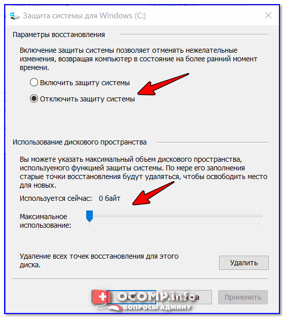 Примечание : кстати, под ползунком, регулирующим использование диска, есть кнопка для удаления старых точек восстановления. Можете воспользоваться ей для очистки и высвобождения места на жестком диске.