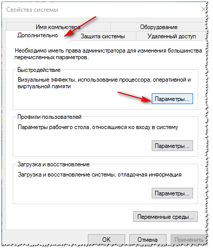 Затем во вкладке «Дополнительно» откройте параметры быстродействия (см. скриншот ниже).