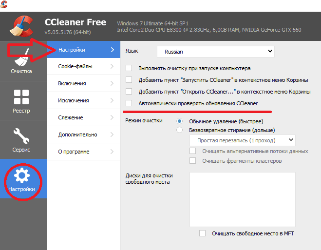Здесь же, поднимаясь вверх по списку открываем графу “Настройки” и отключаем автоматическое обновление CCleaner.