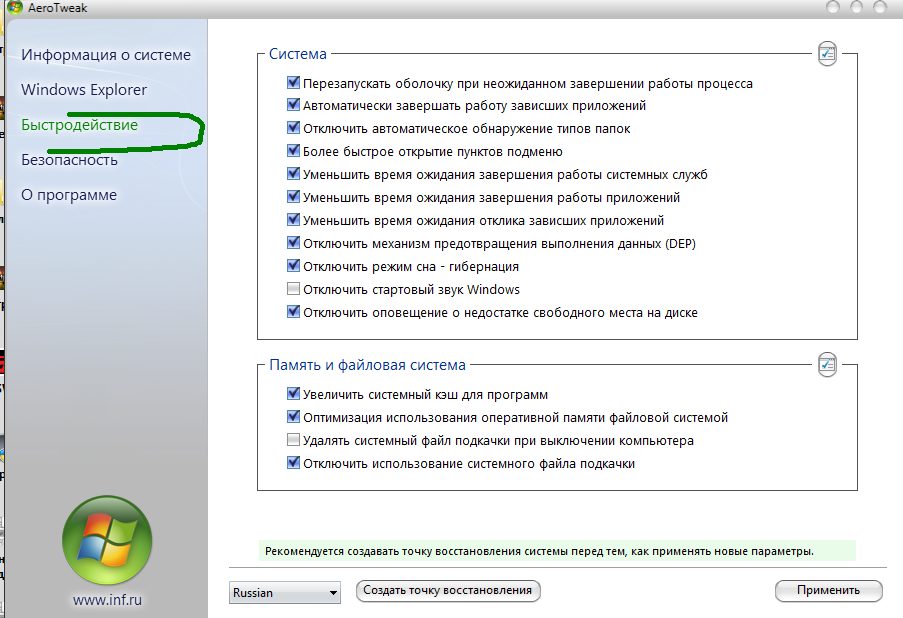 Программа AeroTweak позволяет настроить некоторые важные системные параметры для увеличения быстродействия: