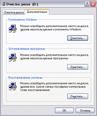 - Во вкладке «Очистка диска» отметьте галочками ненужные файлы и перейдите на вкладку «Дополнительно» (в Windows 8 вкладка «Дополнительно» отсутствует)