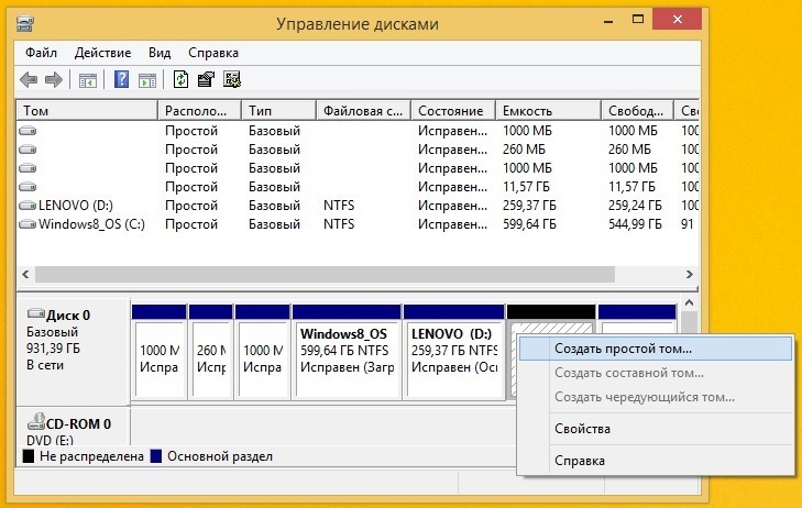 Если из свободного пространства, отделенного от другого раздела, нужно создать новый раздел на жестком диске, то эту неразмеченную область никуда не присоединяют, на ее месте создается новый логический диск (раздел, том).