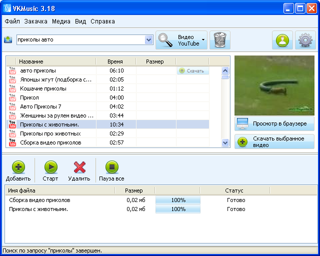 Бесплатная программа VKMusic легко справиться с поиском и скачиванием видео и музыки из ВКонтакте, а также скачивание видео из YouTube. Скачивание из некоторых других заявленных источников не работает. Это связано с тем, что сервисы не заинтересованы в том, чтобы у них скачивали размещенные на сервисе файлы. Сервисам выгоднее, чтобы посетители смотрели видео и слушали музыку непосредственно на их сайтах.