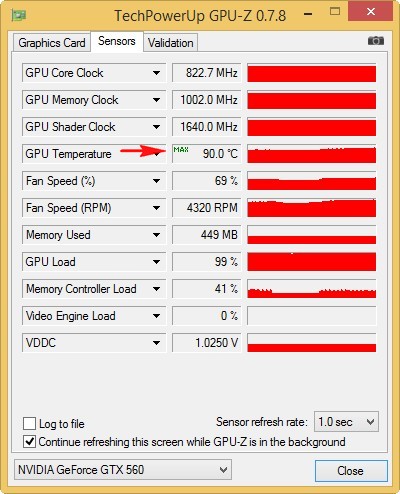 На вкладке «Sensors» можно узнать температуру видеокарты и узнать частоту графического чипа.