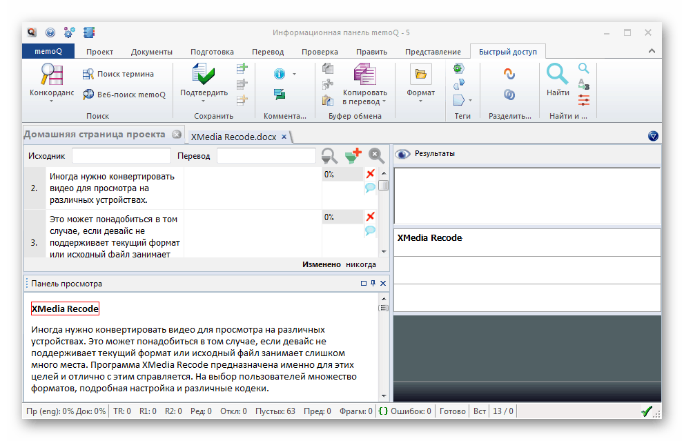 Вы можете поместить один документ и далее работать с ним, заменять определенные слова, отметить выражения или термины, которые не нужно обрабатывать, совершить проверку на ошибки и многое другое. Ознакомительная версия программы доступна бесплатно и практически ничем не ограничена, поэтому отлично подойдет, чтобы познакомиться с MemoQ.