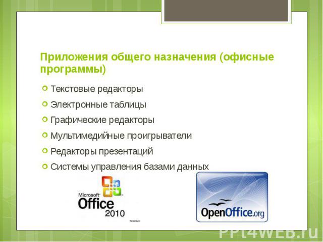 OpenOffice — бесплатный пакет офисных программ, аналог Microsoft Office. Включает в себя компоненты для работы с текстовыми документами, электронными таблицами, презентациями, базами данных, создания PDF файлов и для редактирования векторной графики.