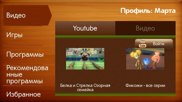 Оформление детского режима подсказывает, что целевая аудитория приложения — дошкольники. В любом случае с точки зрения ребенка тут все максимально просто. Например, при выборе значка «Видео» показываются эскизы всех доступных видеофайлов и каналов на YouTube, а после сразу же начинается воспроизведение.
