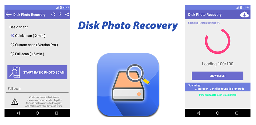 - Приложение сканирует внутреннюю и внешнюю память для восстановления фотографий.