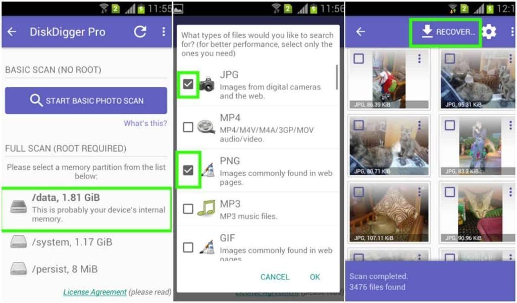 DiskDigger — это инструмент восстановления, который поддерживает устройства Android с рутированным, но не рутированным доступом.Хотя это бесплатный инструмент, он предлагает очень полезные функции. Он имеет базовую функцию сканирования для телефонов без рутирования и полное сканирование для телефонов с рутированным доступом. Этот инструмент также позволяет пользователю просматривать и выбирать файлы перед восстановлением. Чтобы восстановить удаленные фотографии с телефона Android, просто следуйте инструкциям, приведенным ниже.
