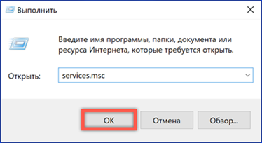Открываем диалоговое окно «Выполнить» комбинацией «Win+r». Набираем в текстовом поле «services.msc» для перехода в консоль управления службами.