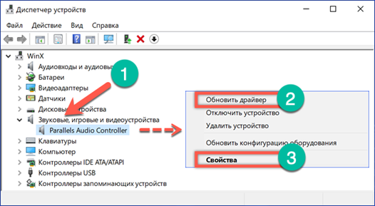 В окне диспетчера разворачиваем ветку звуковых устройств. Выбираем аудиоконтроллер и открываем для него контекстное меню. Здесь можно сразу активировать поиск обновленного драйвера или сначала открыть свойства используемого.