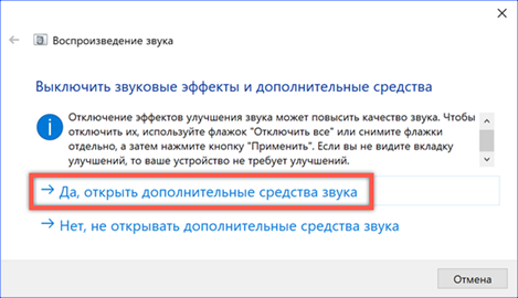 Окно откроется на англоязычной вкладке «Enhancements», что в переводе значит «улучшение». Проставляем галочку в отмеченном цифрой «2» пункте, чтобы отключить использование всех предустановленных профилей.