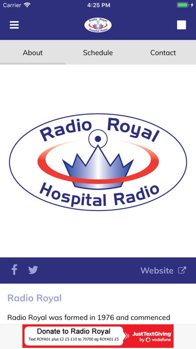 Radio Royal — это зарегистрированная благотворительная организация, основанная в 1952 году. Наша цель — предоставить личную радиосвязь пациентам Королевского лазарета Брэдфорда и улучшить их самочувствие во время пребывания в больнице. Мы делаем это, навещая их у постели больного и, если они того пожелают, проигрываем выбранную ими музыку по прикроватному радиоприемнику. Мы также предоставляем программы, специально адаптированные к потребностям пациентов, с предоставлением местной и больничной информации. Мы предоставляем 24 часа живых и предварительно записанных программ 7 дней в неделю в дополнение к укреплению здоровья и информации для пациентов Королевской больницы Брэдфорда.