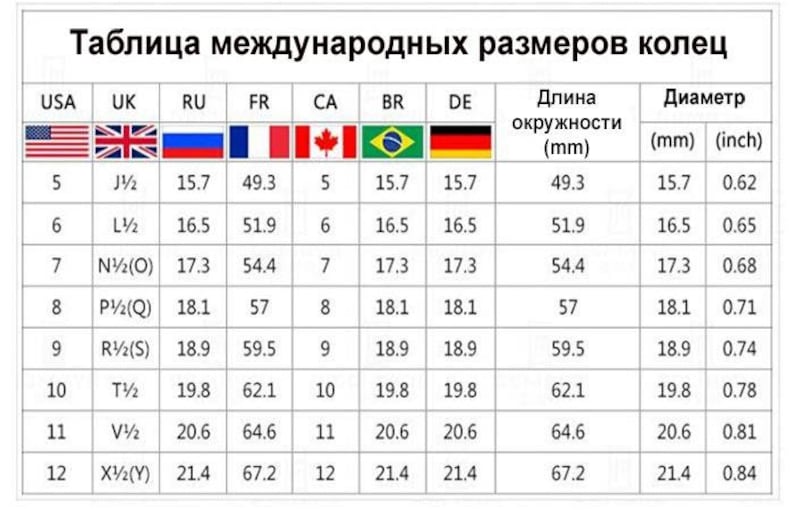 Международная таблица размеров колец