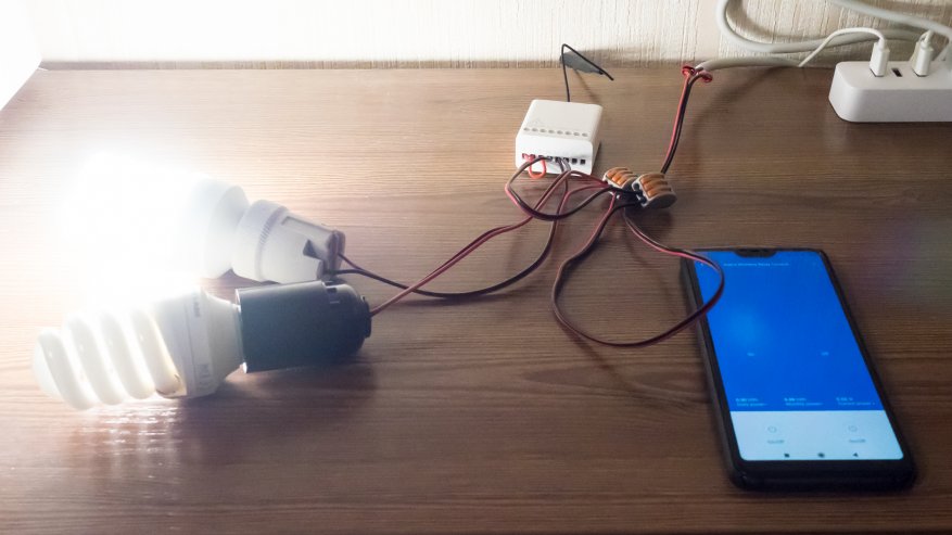 Тестирование начнем с первой схемы подключения, более простой, предполагающей использование только инфраструктуры умного дома. Участвуют две нагрузки и реле.