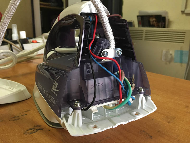 Под ней обнаруживается клеммная колодка к которой крепится шнур. Если проблемы со шнуром, можно дальше утюг не разбирать. Но если со шнуром все нормально, придется разбирать дальше, а с этим могут возникнуть проблемы.