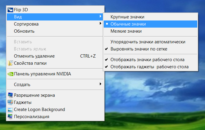 - Нажимаем на любом пустом месте рабочего стола правой кнопкой мышки.После снятия галочки с «Отображать значки рабочего стола» ярлыки исчезнут