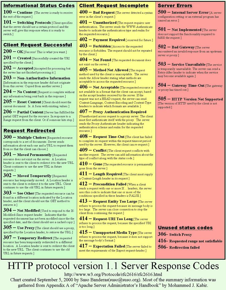 о Коды состояния HTTP. Коды состояния сообщают нам, был ли HTTP-запрос успешным, неудачным или чем-то средним.Рассмотрим пять основных кодов состояния: