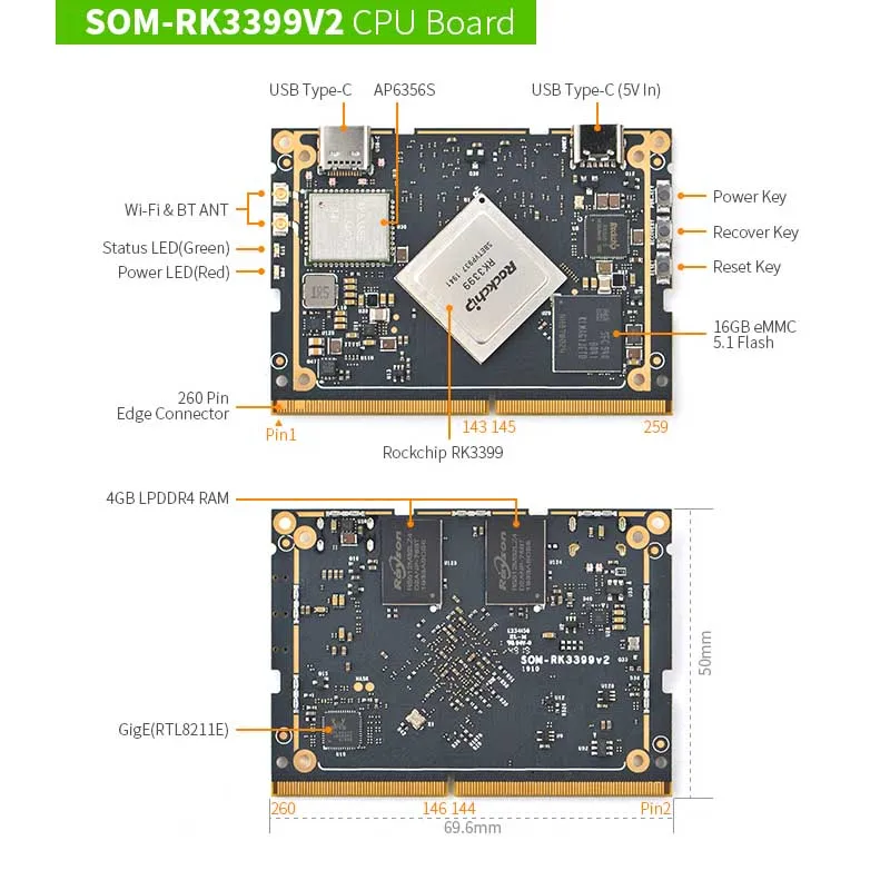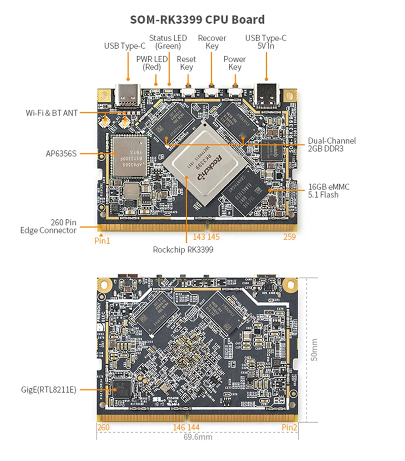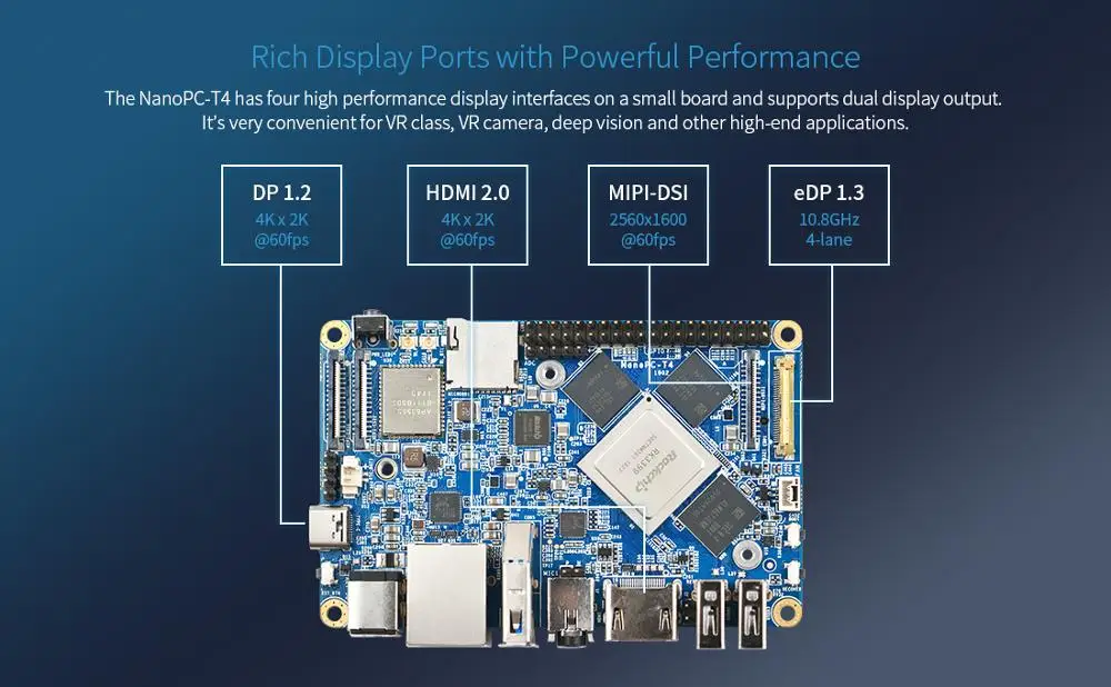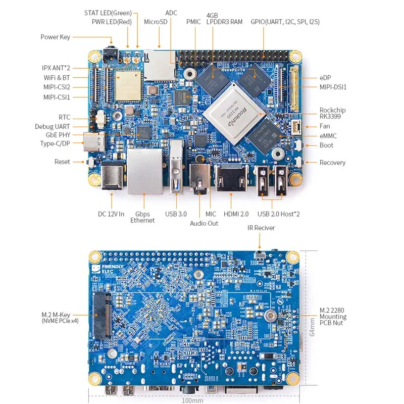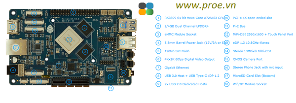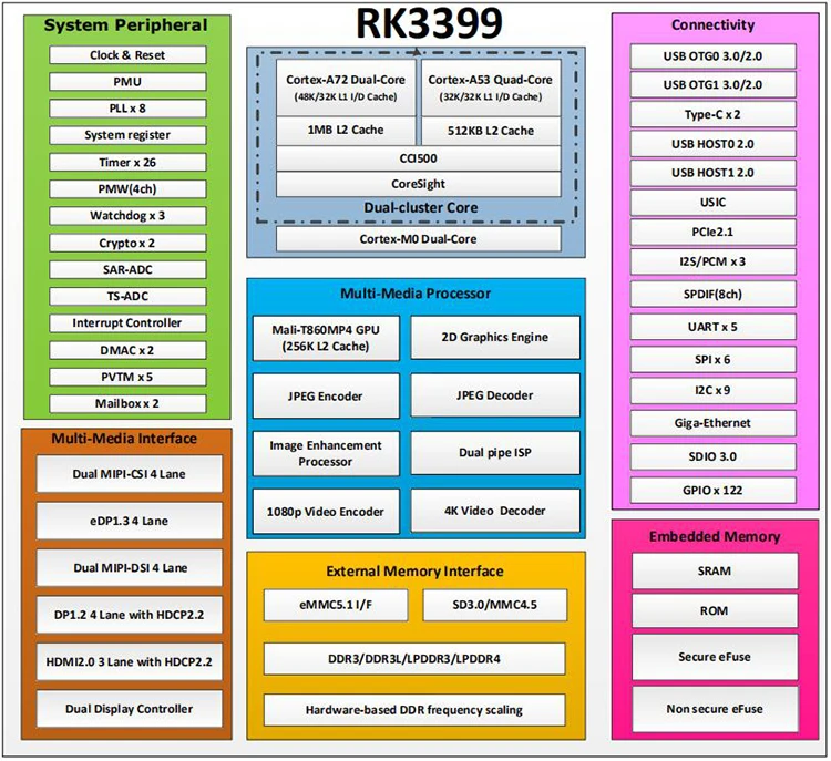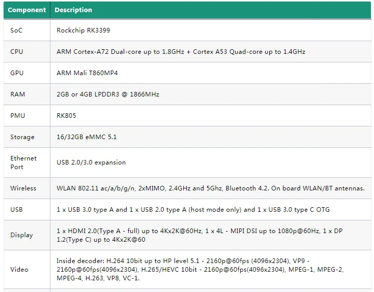 — Центральный процессор (CPU) – 6-ти ядерный Rockchip RK3399, 4хARM Cortex-A53 1.53 ГГц и 2хARM Cortex-A72 2 ГГц