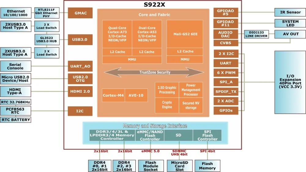 Еще одним важным преимуществом для поклонников KODI является отличное сочетание мощного графического процессора Mali-T860MP4 (4 ядра) с интерфейсом HDMI версии 2.0. Согласно Википедии, новая SoC RK3399 поддерживает аппаратное ускорение видео.