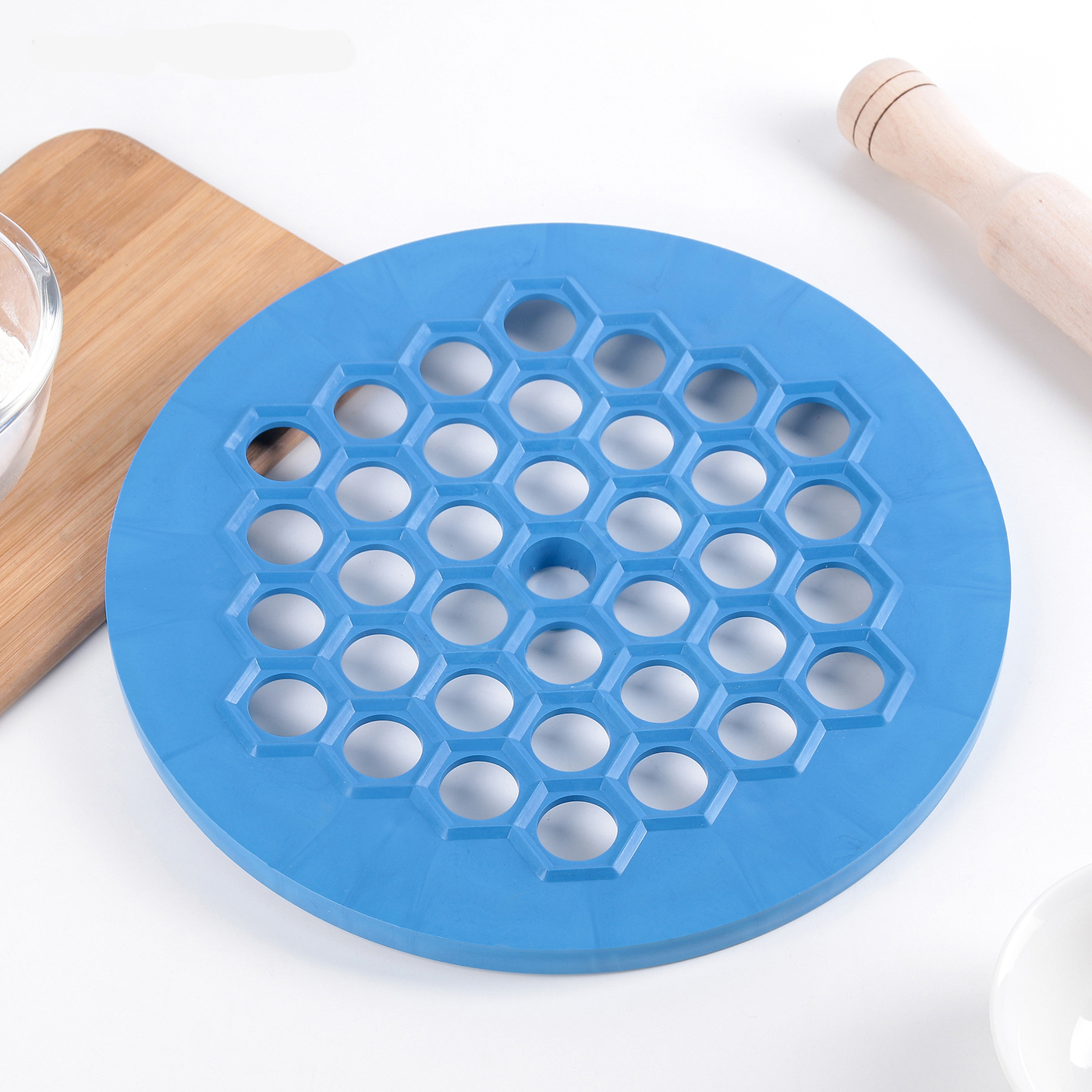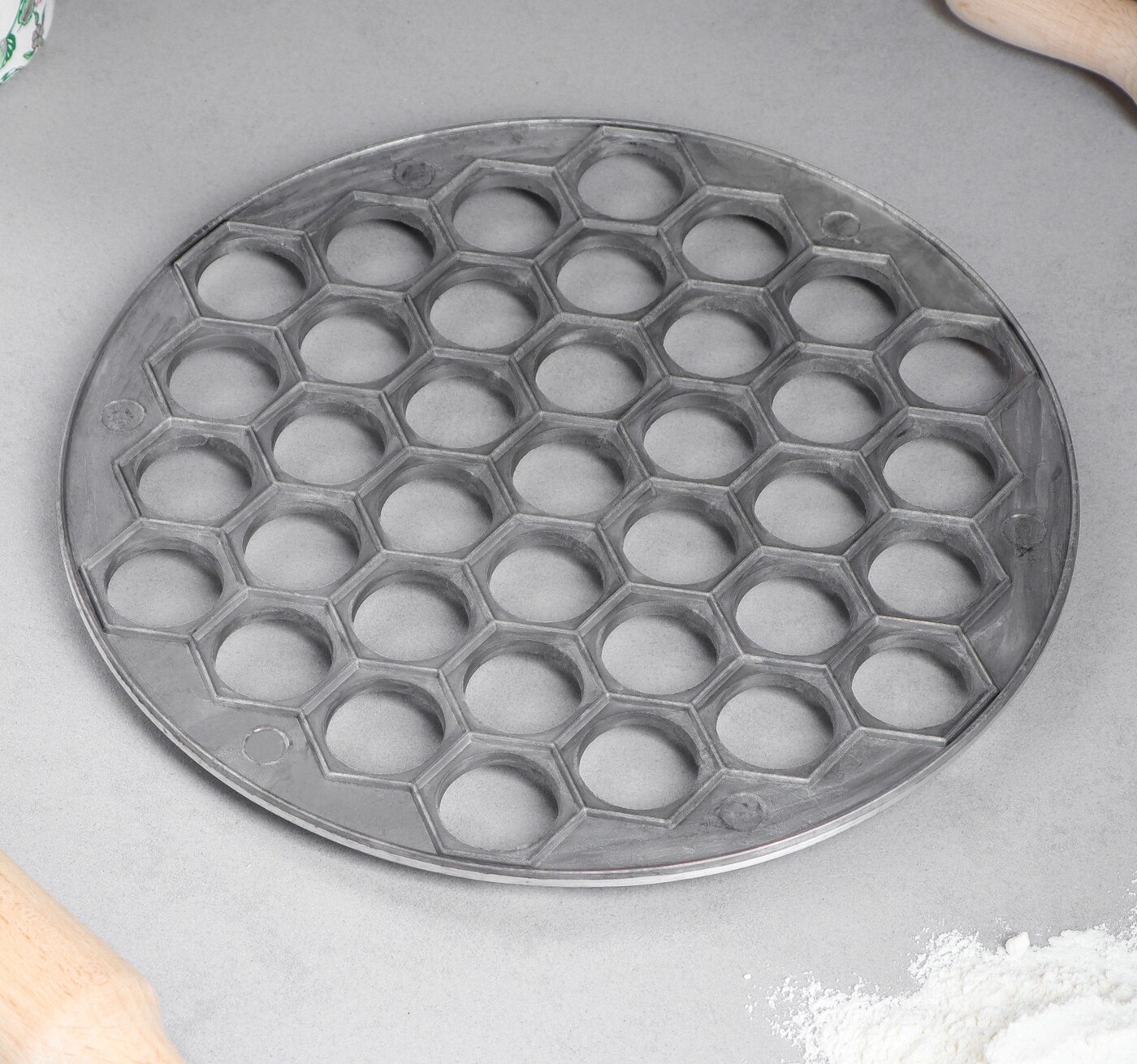 Решетчатая основа служит формой для укладки листа раскатанного теста и начинки. Продавливание пельменей происходит при помощи скалки или второй части заготовки.