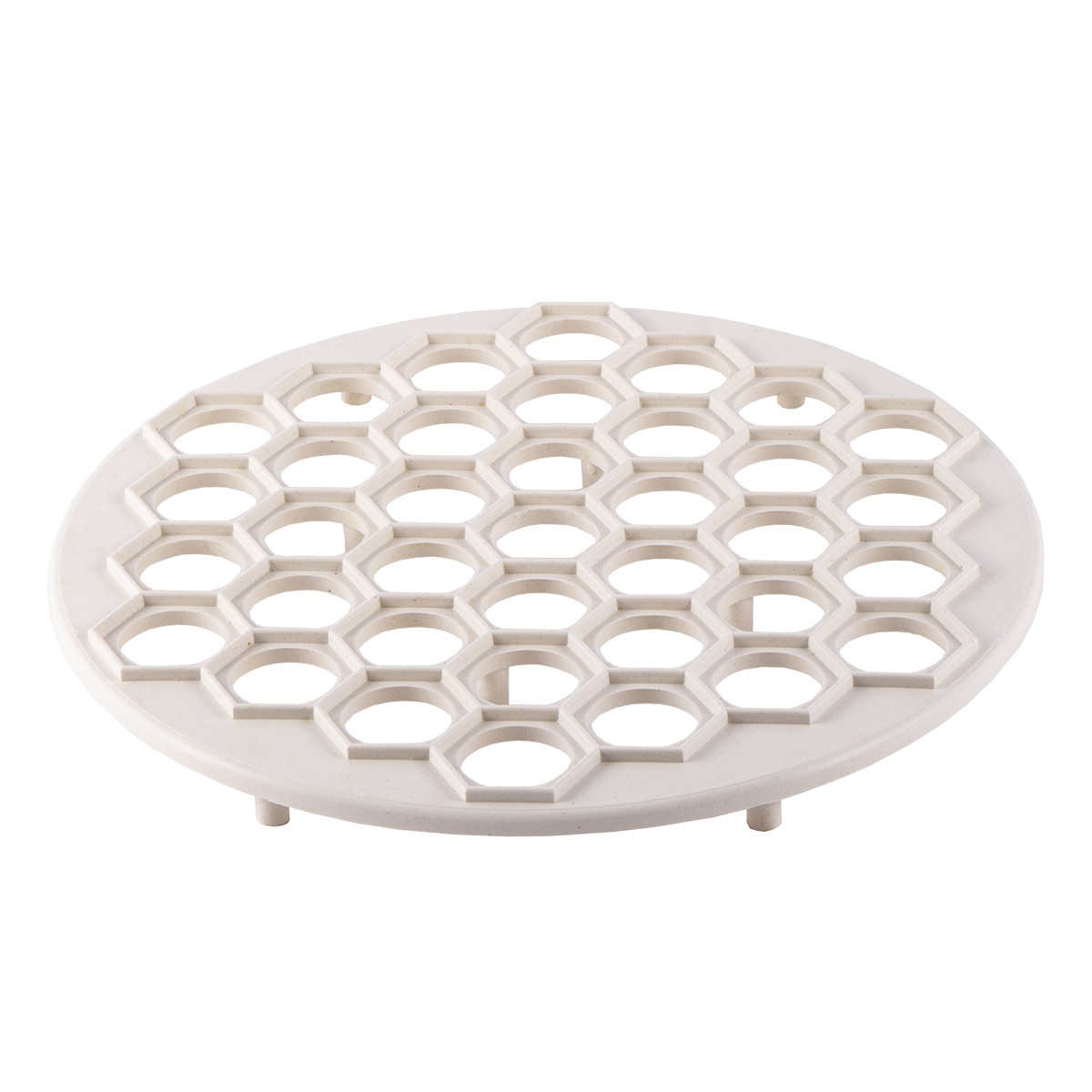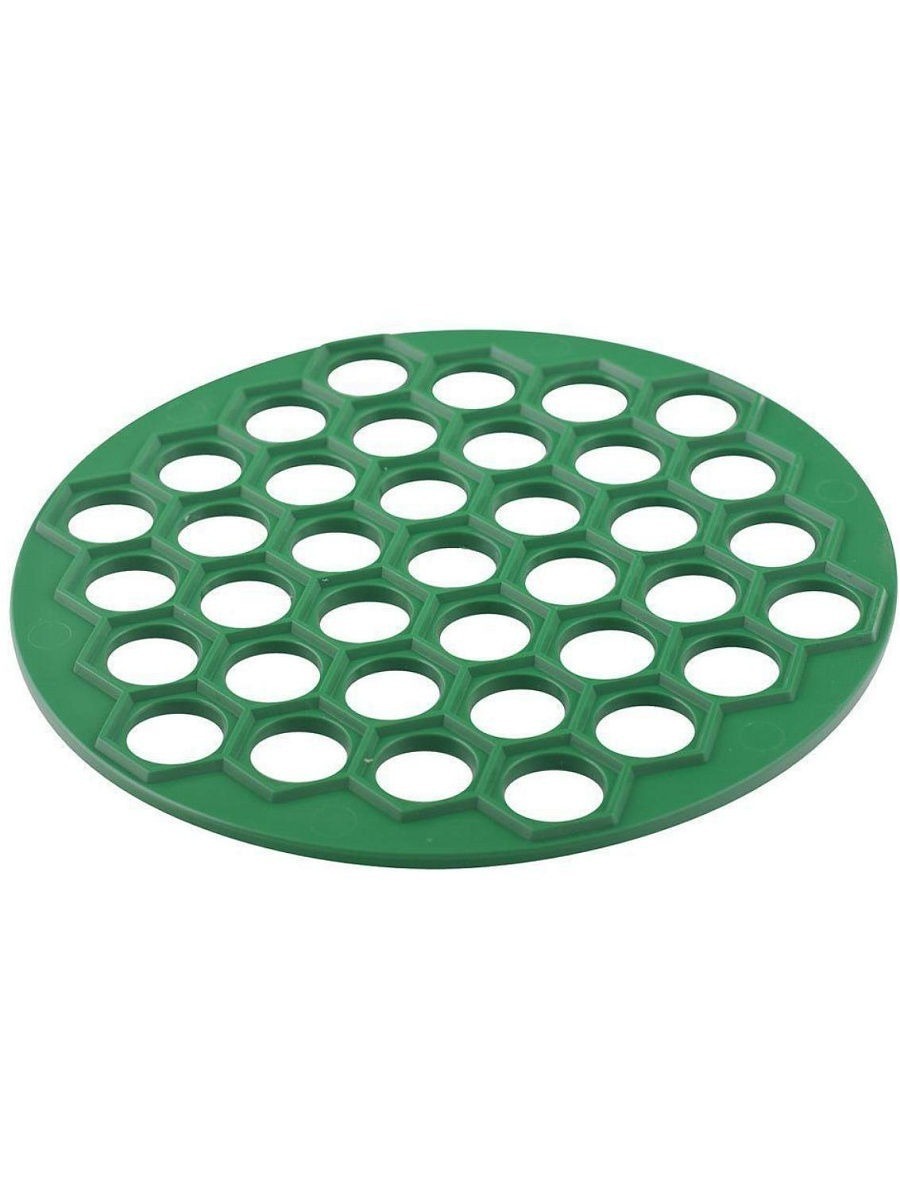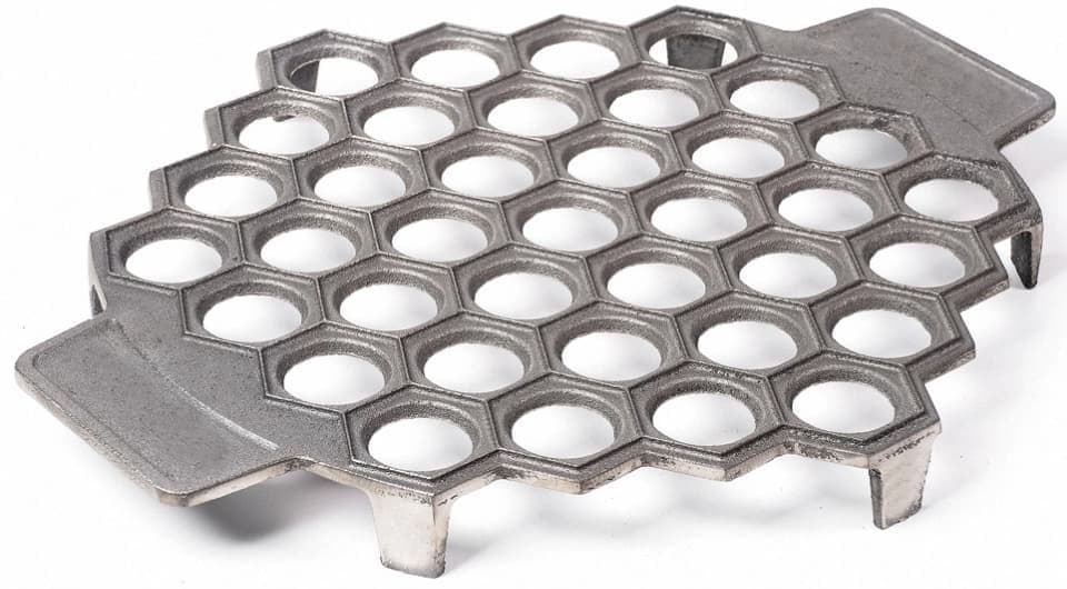 - Решетки. Самый распространенный вариант пельменницы, бывает металлическим и пластиковым. Форма готового продукта варьируется от круглого до овального, в зависимости от размера ячеек диаметр также оказывается разным. Решетчатая основа служит формой для укладки листа раскатанного теста и начинки. Продавливание пельменей происходит при помощи скалки или второй части заготовки.