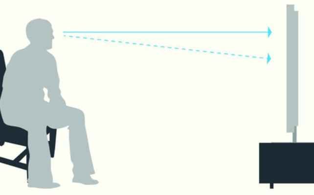 В отличие от работы за монитором, при просмотре видео (пассивном наблюдении за событиями на экране) желательно, чтобы центр экрана располагался немного выше уровня глаз, чтобы зритель, даже будучи пассивным наблюдателем, был в гуще событий, можно сказать участвовал в них, а не смотрел на это свысока.