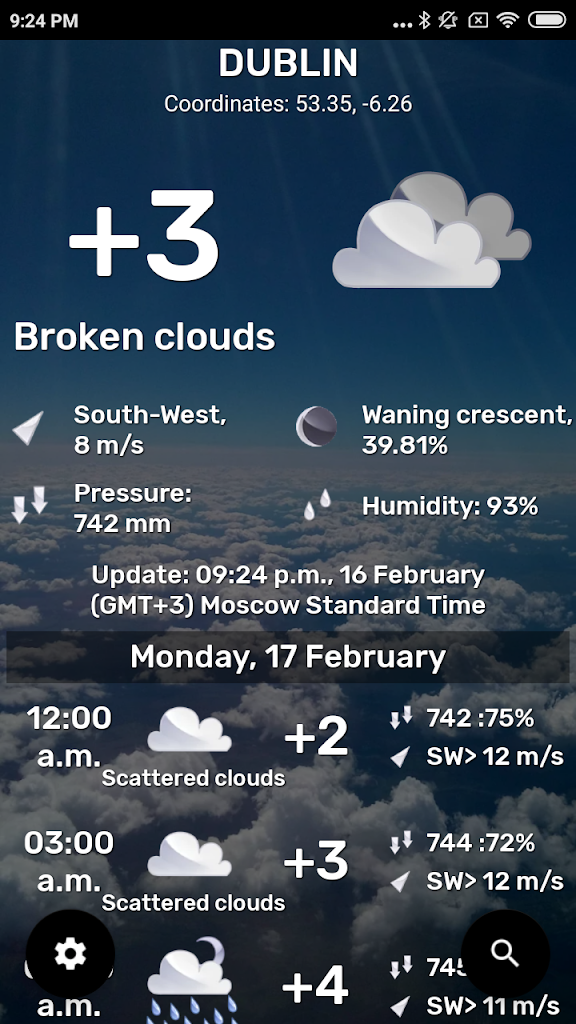 Также оно предоставляет полный набор метеосводки об актуальном климате на одном, включая уровень влажности, УФ-индекс, фазы луны или предполагаемые дожди по частям дня. Yahoo получил продуманный дизайн с красивыми пейзажами и фотографиями природных явлений. Его удачно дополняют яркие анимации и общая плавность всех действий. Поэтому пользоваться Yahoo крайне приятно.