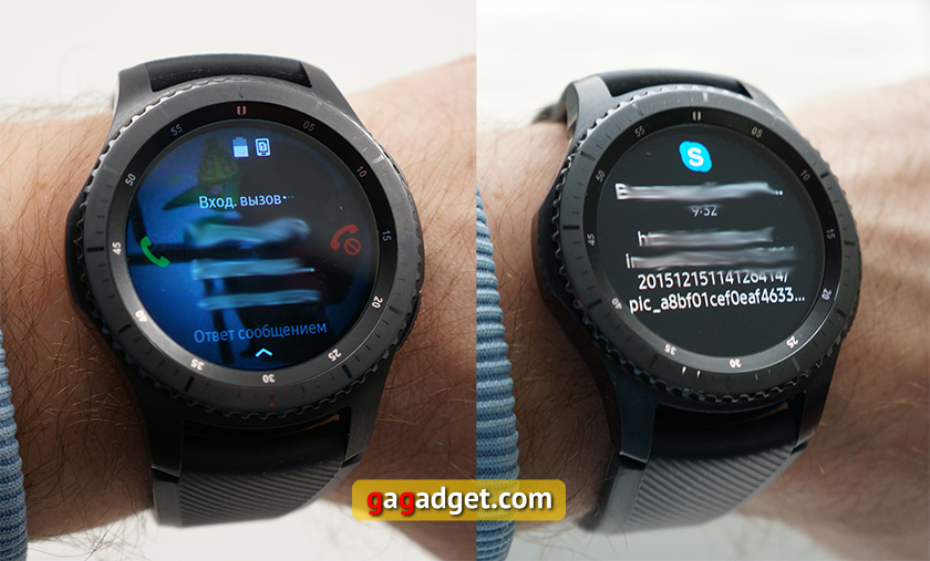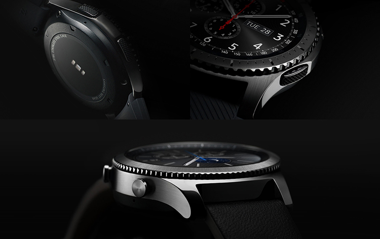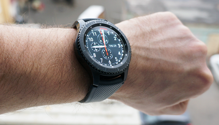 Frontier-версия смотрится брутально. Как и в Gear S2, экран часов круглый и без каких-либо «мертвых зон». Корпус стальной, серый. Управлять Gear S3 можно как при помощи ободка (безеля), так и «перелистыванием» на самом экране. Если у вас тонкая рука, возможно, стоит присмотреться к версии Classic — она на несколько миллиметров у́же. Например, на руке автора статьи Frontier смотрелись чересчур громоздко.