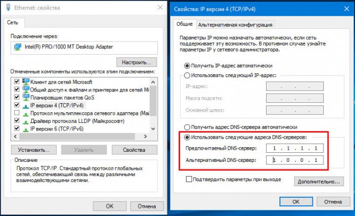 выберите протокол IP версии 4 (TCPIPv4), кликните по нему дважды, в открывшемся окошке свойств включите радиокнопку «Использовать следующие адреса DNS-серверов» и установите для предпочитаемого DNS-сервера 1.1.1.1, а для альтернативного 1.0.0.1.![]()