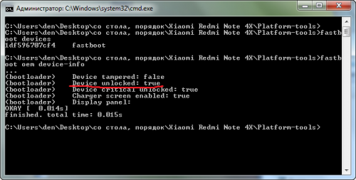 Device unlocked: true — разблокирован загрузчик