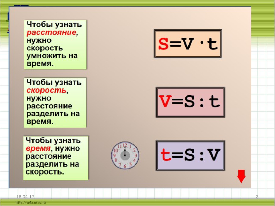 Формула времени Чтобы найти время, нужно разделить расстояние на скорость: t = s : v |