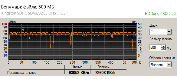 Например, для тестируемого носителя информации SDA3/32GB класс скорости UHS-I (U3) указывает на минимальную скорость записи 30 МБ/с, а максимально заявленная составляет 80 МБ/с.