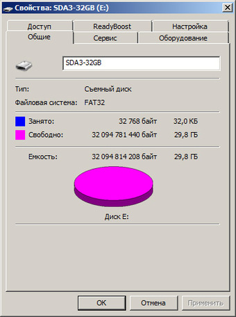 Карта памяти отформатирована производителем в файловую систему FAT32, полная емкость устройства составляет 32 млрд 94 млн 814 тысяч 208 байт, что соответствует 29,8 ГБ. Расхождение с заявленным объемом 32 ГБ происходит по причине того, что производитель указывает емкость устройства в десятичной системе счисления, а не в двоичной.