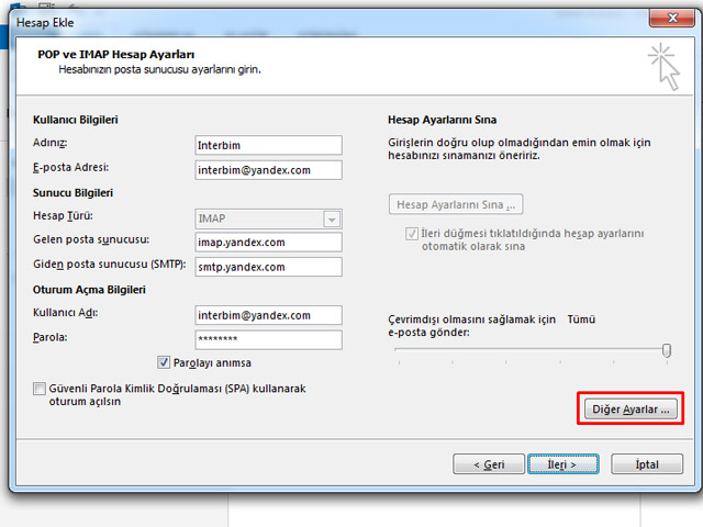 imap.yandex.com.tr;bağlantı güvenliği — SSL;