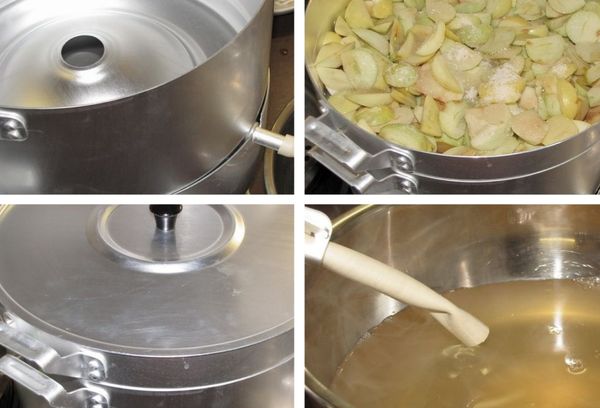 4. В нижнюю кастрюлю соковарки влить воду (около 4 литров), довести до кипения. Поверх кастрюли с кипящей водой установить среднюю часть соковарки (предназначенную для сбора стекающего сока) и кастрюльку с фруктами и сахаром. Плотно закрыть.