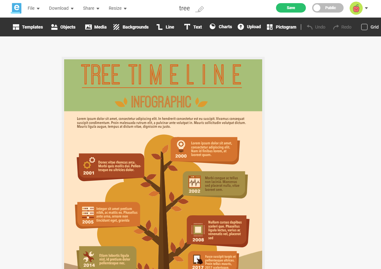 Сервис предлагает несколько десятков бесплатных тематических шаблонов, которые можно редактировать на собственное усмотрение. Для этого предлагается воспользоваться библиотекой объектов, которые сгруппированы по темам. Также есть возможность выбора фона, используемых линий, типа диаграммы (с подстановкой значений). Имеется сетка, которая помогает точно выравнивать объекты. Поддерживается установка прозрачности элементов и порядка слоев.