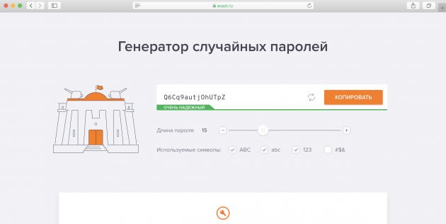 Лаконичный сервис Avast, позволяющий создавать и копировать надёжные шифры в один клик. «Рецепт» можно менять по своему усмотрению: длина пароля, использование прописных и строчных букв, а также цифр и спецсимволов. При этом на экране сразу отобразится стойкость ко взлому выбранной комбинации.