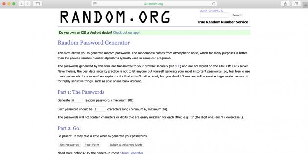 Популярный генератор случайностей способен создавать не только последовательности чисел, но и стойкие пароли. По умолчанию сервис выдаёт пять восьмизначных шифров, но при желании за один раз можно сгенерировать до 100 штук. Из дополнительных опций доступны настройки рандомизации и выбор длины, от 6 до 24 символов.