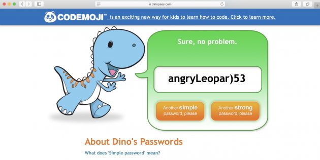 Ориентированный на детей генератор с забавным оформлением и всего двумя опциями. Умеет создавать простые пароли, состоящие из слов и цифр, а также более сложные, в которые добавляется по одному спецсимволу.