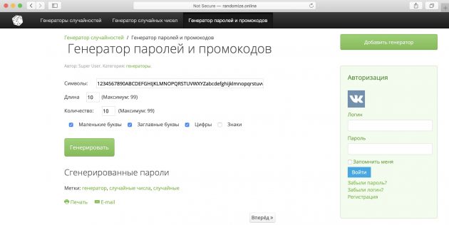 Сервис с простым оформлением, но довольно неплохими возможностями. Позволяет за один раз создать до 100 паролей и выдаёт их аккуратным списком. Длина — до 100 символов. Вы сами можете выбрать, какие именно знаки войдут в комбинацию.