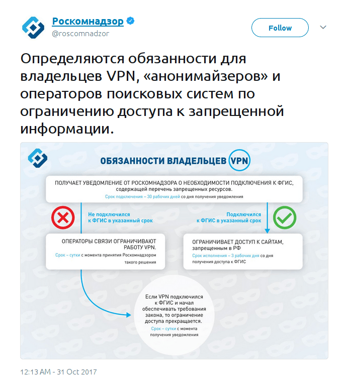 В феврале этого года глава Роскомнадзора Александр Жаров на деловом завтраке, устроенном «Российской газетой», предложил легальным анонимайзерам добровольно ограничивать доступ к запрещенным в России сайтам. Кроме того, он заявил, что вопрос о блокировке анонимайзеров на данном этапе не стоит. Поскольку, с одной стороны, такие сервисы могут быть легальными программами, которые используются для защиты информации при оказании коммерческой услуги, например шифровки и защиты информации для банков, отмечал Жаров. С другой — блокировка небольших программ, которыми пользуются, чтобы попасть на закрытый сайт, по мнению Жарова, не имела смысла, так как на место заблокированного «придут новые, и эта гонка будет бесконечна».